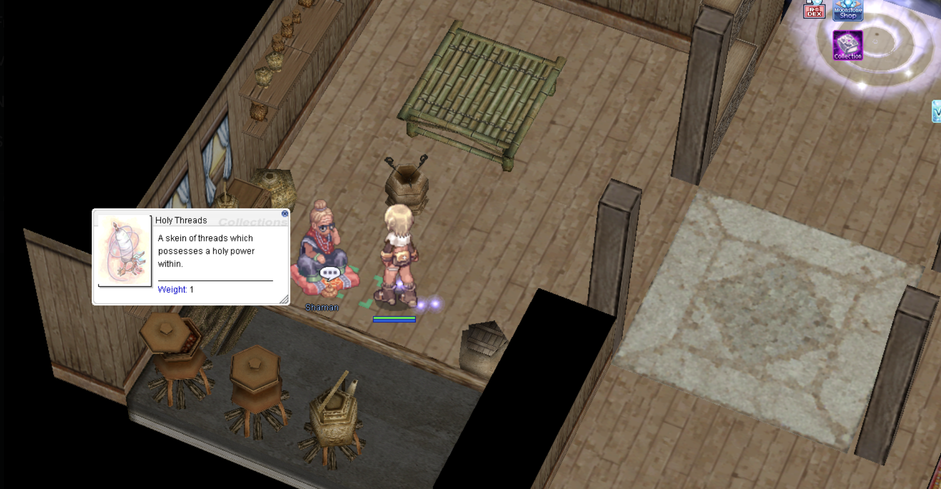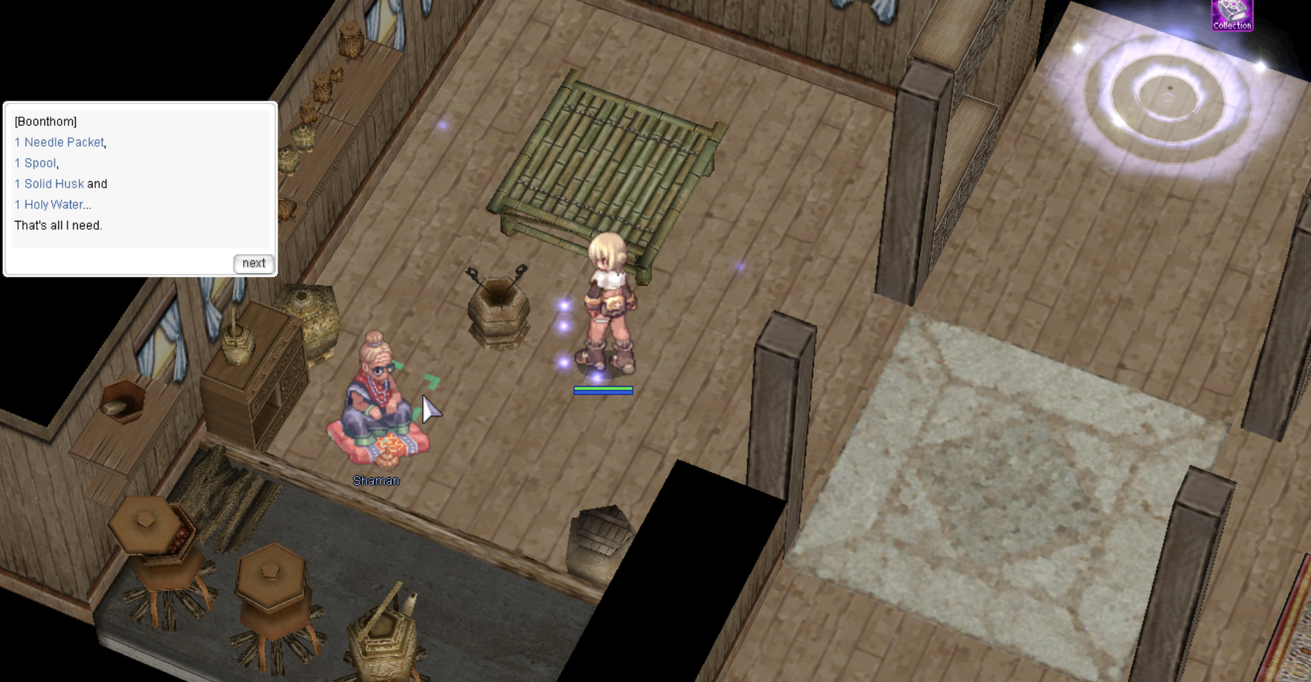 Shaman asks for a few items (Needle Packet, Spool, Solid Husk and Holy Water).