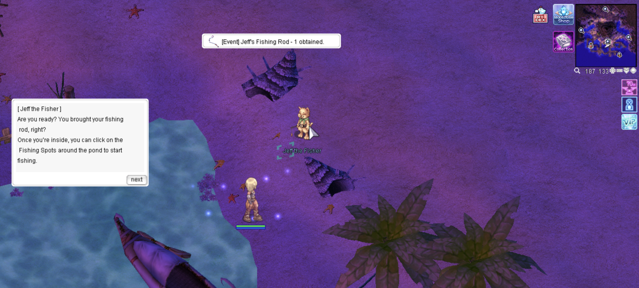 • Speak with NPC Jeff the Fisher at Comodo (190, 138) to receive a special job.