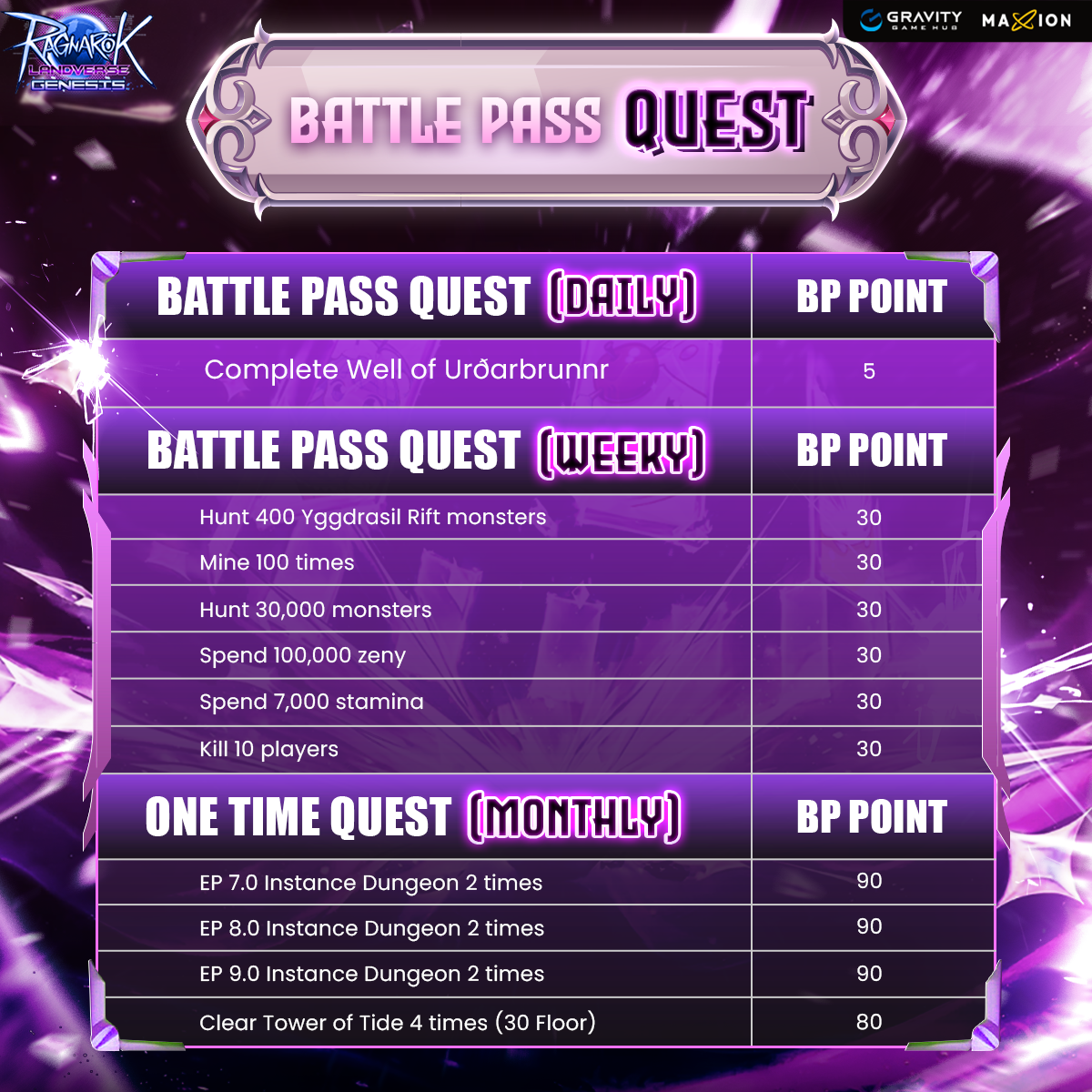 • Quests reset every Monday at 00:00 (UTC+8)