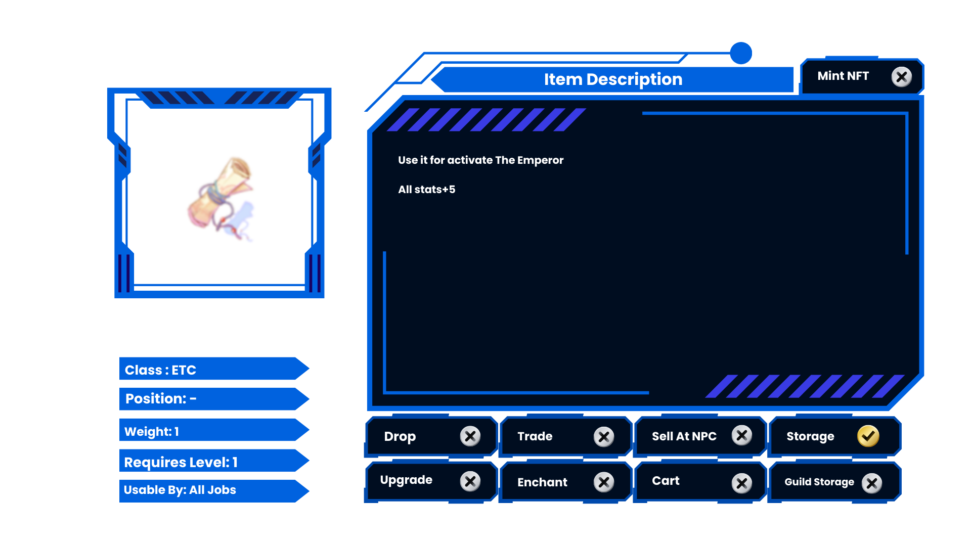 Title: The Emperor 1 Title Item (All Stats +5). Bound.