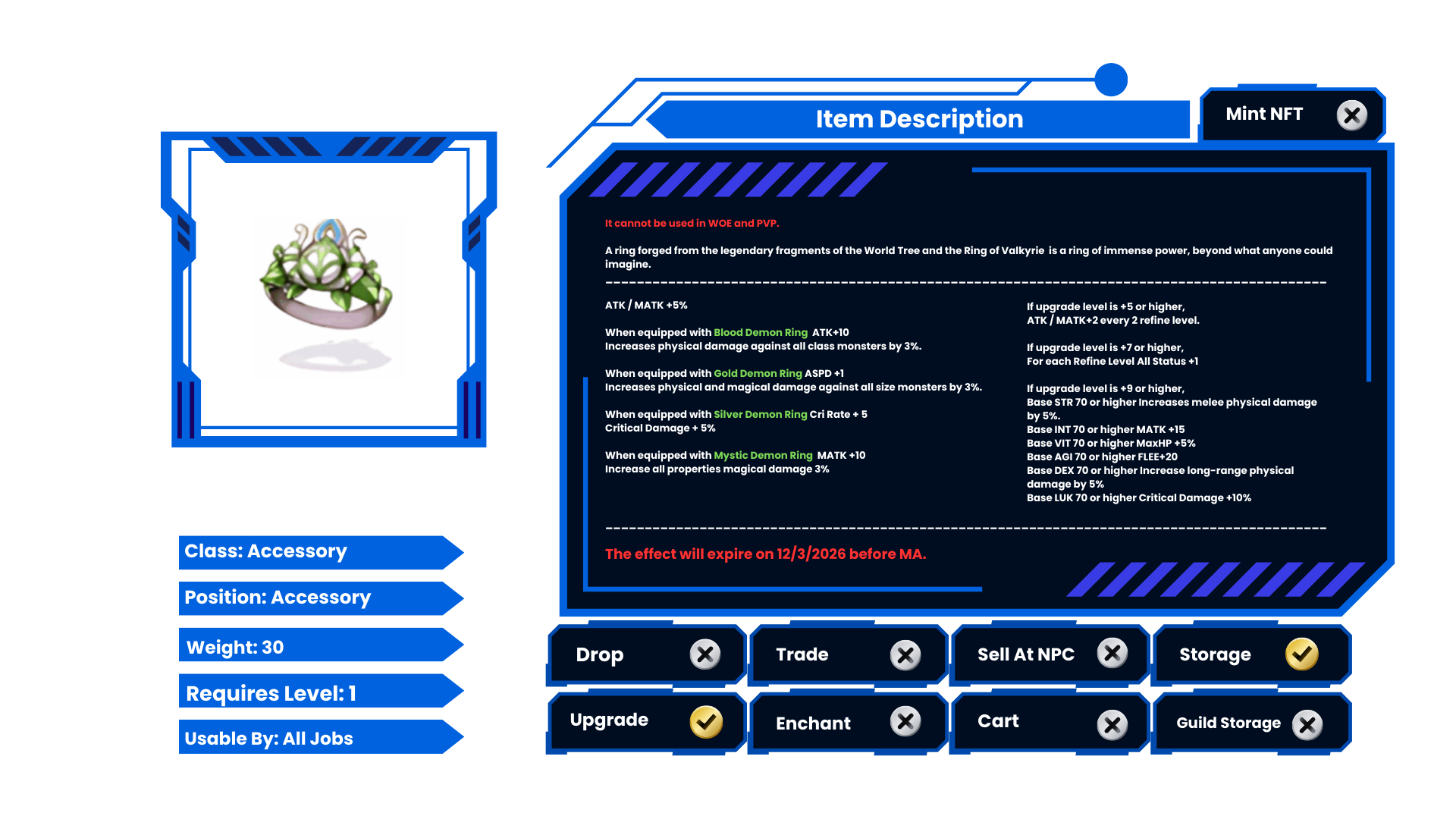 - If the ring is damaged (red), you can repair it using 1 piece of either [Event] Mystic Leaf of Yggdrasil OR [Event] Ring of Valkyrie.