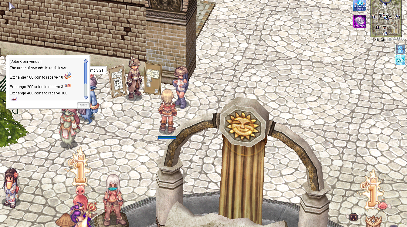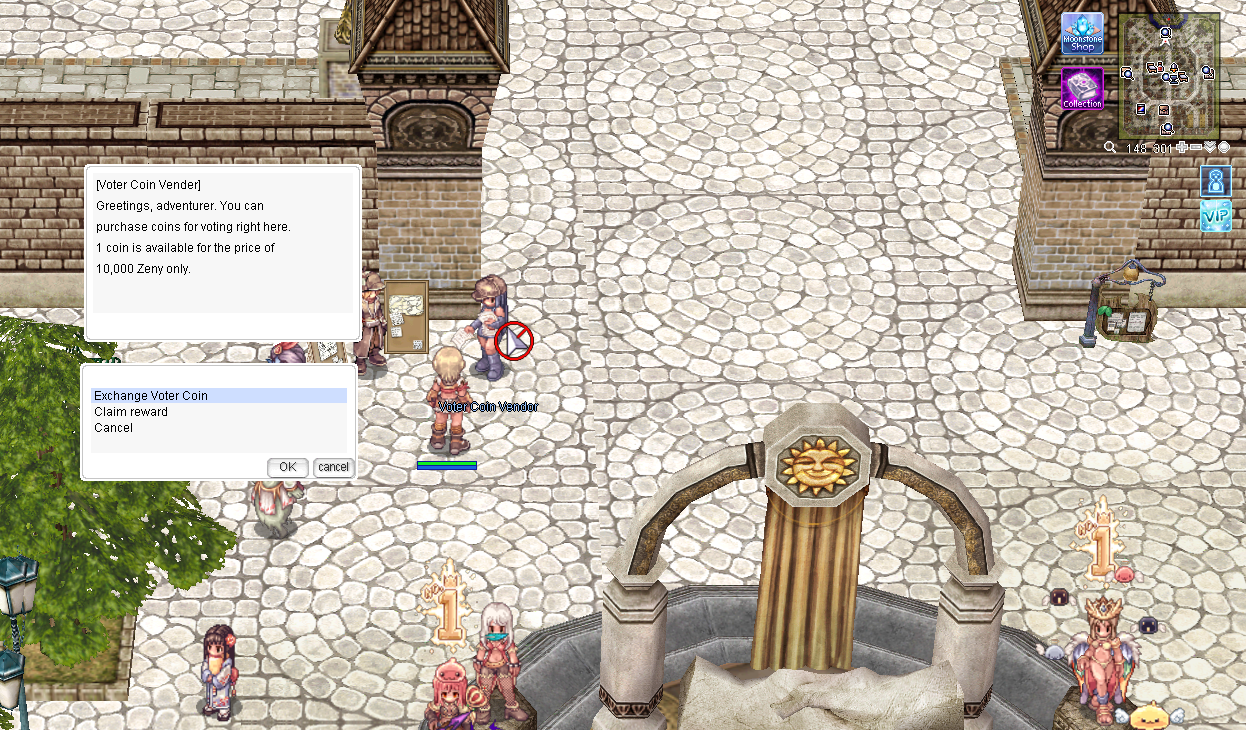 Exchange Zeny for Voter Coins with NPC Voter Vender. The exchange rate is 10,000 Zeny for 1 Voter Coin.