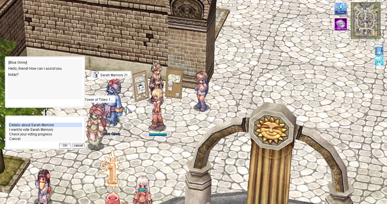 Donate Voter Coins to either NPC Vote Sarah Memory or NPC Vote Tower of Tides.